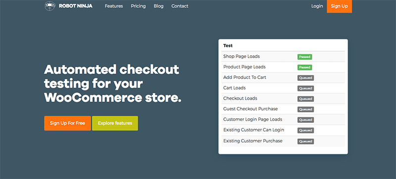 Robot Ninja can test your WooCommerce store in a fraction of the time it takes to do it manually. Plus, the tests are comprehensive and include everything from checking core pages are loading properly to making sure existing customers can log in and guests can successfully checkout.