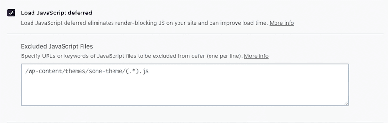 One major cause of slow web pages is the so-called “blocking script”. If you load JS deferred, then you’ll improve load time. WP Rocket can help you do so with one click:
