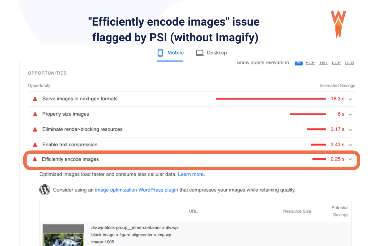 In this report, we also find the “Efficiently encode images” warning (fixable with Imagify)