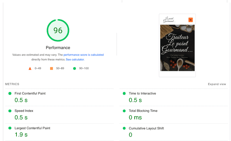 Once we activated WP Rocket and enabled a few performance options, we got a 96/100 score. Plus, the Largest Contentful Paint is 1.9 s – it’s now green.