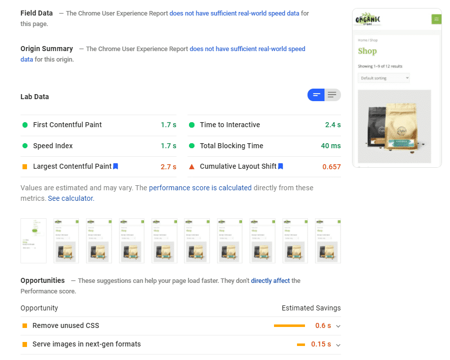 By running a test on a page without WP Rocket, we got an orange flag regarding this specific audit: