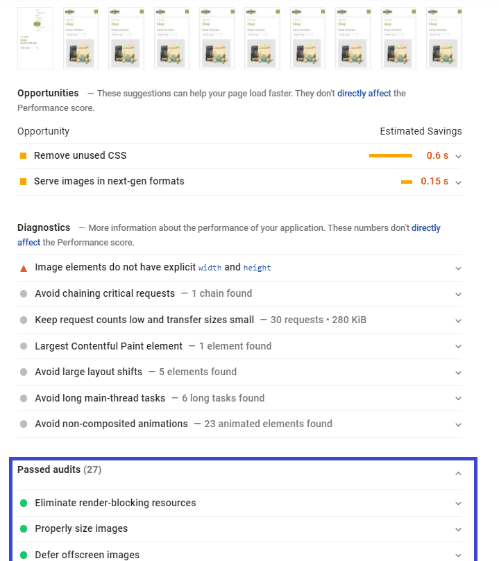 On the other hand, if Lighthouse doesn’t detect any issues about offscreen images, you’ll see the audit under the “Passed audits” section: