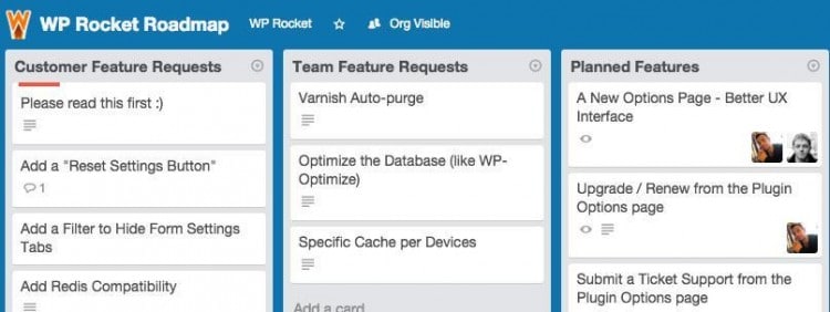 We have been inspired by iThemes Security. For our public roadmap we are using Trello which is a participative tool. This allows anyone to vote for features to be integrated into WP Rocket.