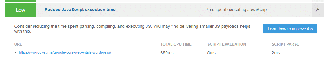 If your URL has any JS Execution time issues, Google PageSpeed Insights will show a warning in the Diagnostics section: