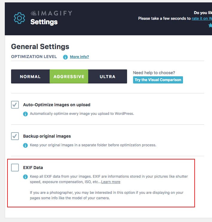 Image compression plugins for WordPress can help reduce the size of your images by removing unnecessary metadata. Imagify, for example, removes EXIF data by default, but gives you the option to keep it should you want to.