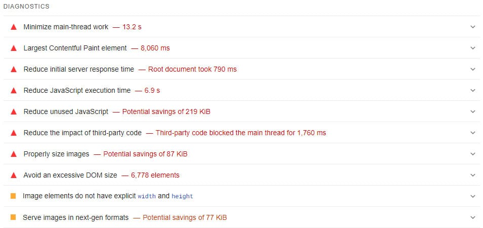 So, how can you fix a failed LCP? Look for these elements in your Diagnostics (see example above).