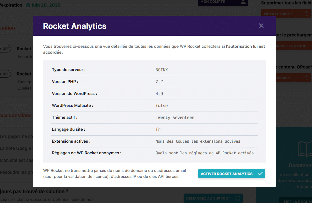 Dans le cadre de WP Rocket, l’analyse se traduirait par connaître quelles options de WP Rocket sont activées et l’environnement du site : version de PHP & WordPress, liste des plugins actifs, etc.