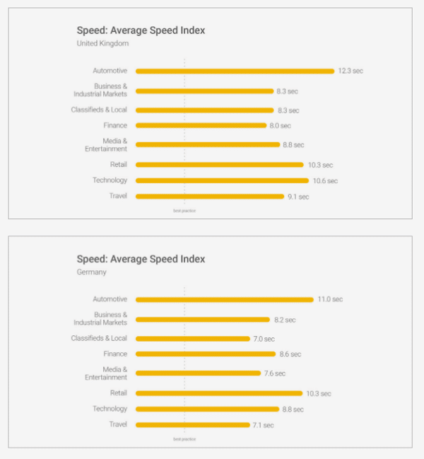 En 2017, Google a publié les résultats d’une large étude sur la vitesse des pages web mobile (900.000 landing pages étudiées, dans 126 pays) : 70% d’entre elles – testées avec une connexion 3G – ont pris quasiment 7 secondes pour afficher leur contenu situé au dessus de la ligne de flottaison (partie de la page visible sans que le visiteur n’ait à scroller). Quant au chargement complet, il dépasse les 10 secondes…