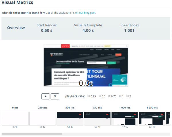 A l’instar du Start Render, le Speed Index se base lui aussi sur l’analyse vidéo du chargement de la page web. Mais cette fois-ci cet indicateur calcule la vitesse moyenne d’affichage des éléments se trouvant dans la partie visible de la page web. De fait, le Speed Index synthétise, en une seule valeur numérique, toute la complexité et la progressivité de l’affichage de la page web, telle que le perçoit le visiteur. Ce qui en fait aujourd’hui l’un des indicateurs le plus révélateur de l’expérience utilisateur en matière de performance. Vous noterez d’ailleurs que l’étude de Google citée précédemment se base sur le Speed Index !