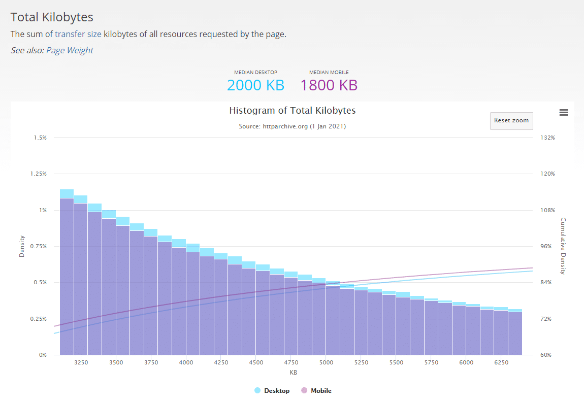 In 2011, web pages on average were 717 KB. In 2021, the average is 2000 KB from desktop and 1800 from mobile.