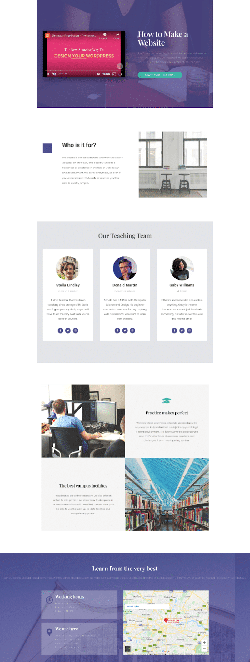 In terms of content, my WordPress site contains some text, a few social media icons, 8 images, an embedded video from YouTube, a map with a pin (from Google Maps), and 3 testimonials from clients with their photos.