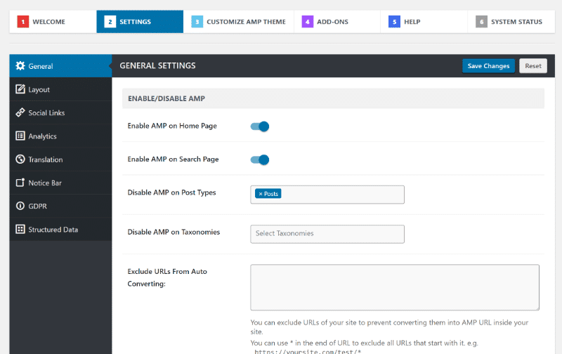 When you first install AMP for WP, it will give you an installation wizard that helps you get up and running with the most important settings. Then, you’ll get a detailed settings area where you can control the plugin’s many features: