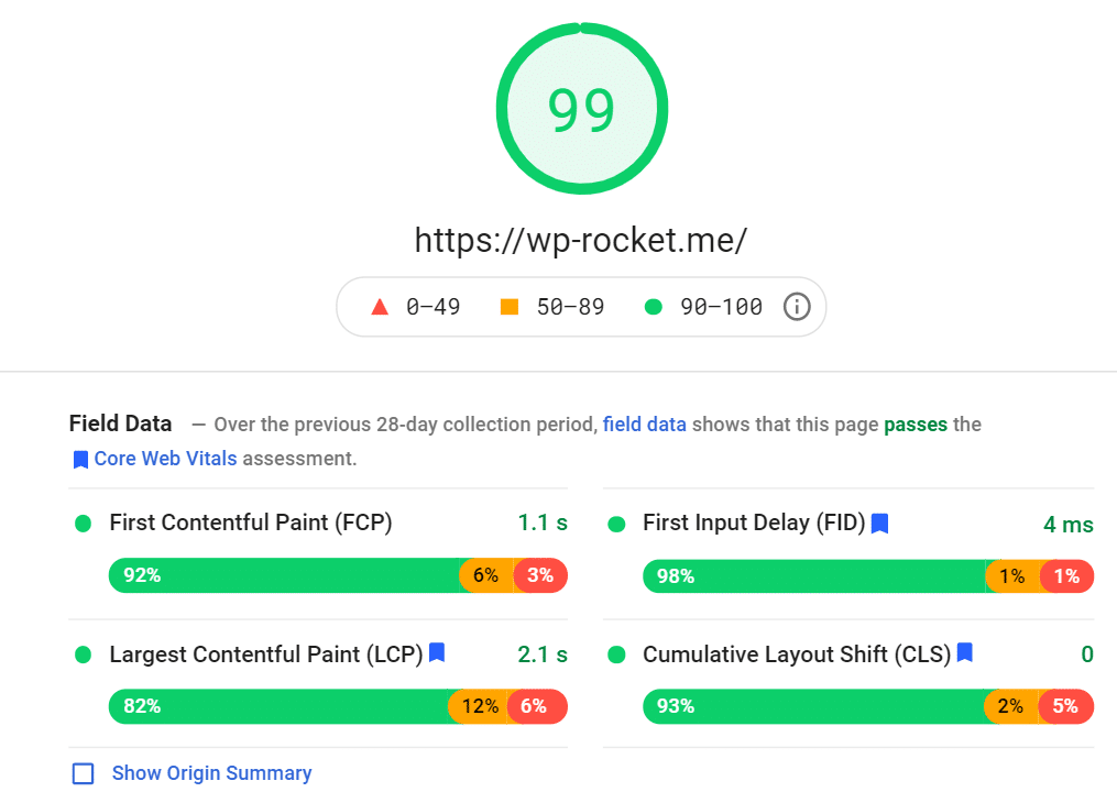 For example, WP Rocket optimizes your code, caches your content, implements lazy loading on your media, and optimizes your database in a few clicks. We’ve also seen that the plugin can help you get a green score on Google PageSpeed Insights: