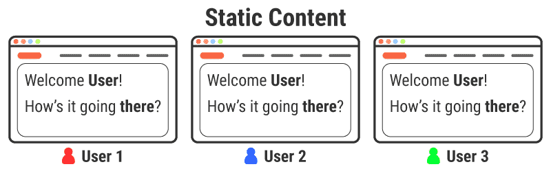 Dynamic content isn’t the same on webpages for all users. It’s customized to every user based on several factors such as location, device, time of day, user profile settings, etc. Dynamic webpages can also change on-the-fly based on user input. This makes websites more interactive, engaging, and personalized for every user.