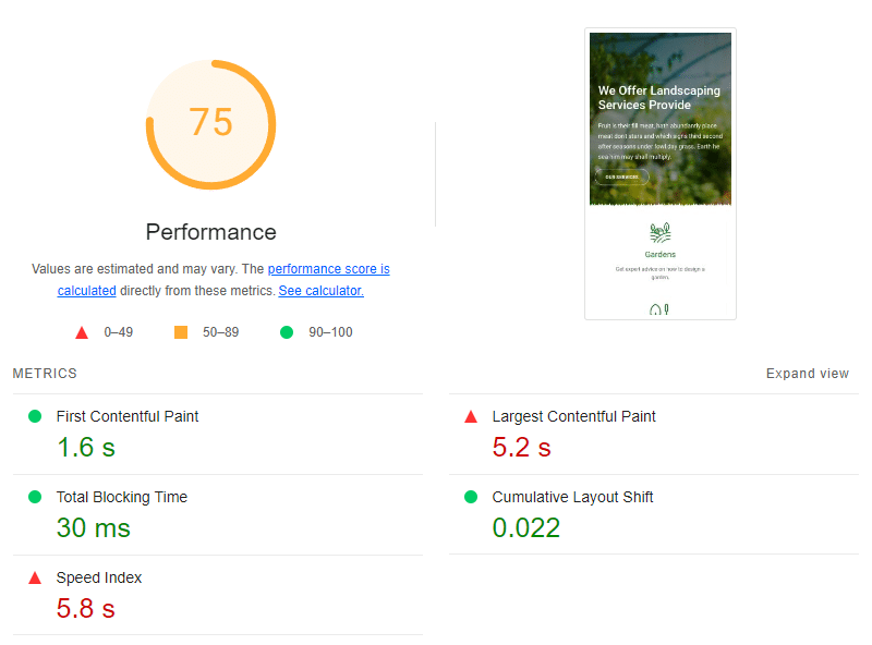 Comme vous pouvez le voir, nous avons obtenu un score de performance de 60/100 – dans la zone orange. Plus grave encore, la note LCP est dans le rouge, comme d’autres indicateurs Lighthouse, tels que le Speed Index.