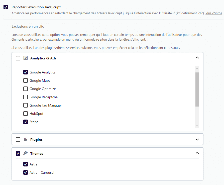 Supposons que votre site utilise Google Analytics et Stripe et qu’il soit construit avec Astra ; et bien vous allez voir ces options indiquées dans la liste. Il vous suffira simplement de les sélectionner pour que ces scripts ne soient pas retardés. C’est aussi simple que ça !