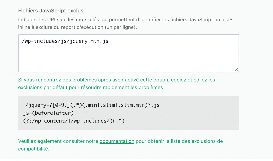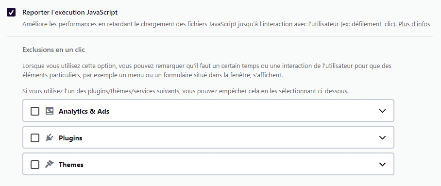 Bien entendu, vous trouverez toujours l’option “Fichiers JS exclus”, qui vous permet d’indiquer des fichiers JavaScript supplémentaires à exclure du report d’exécution.
