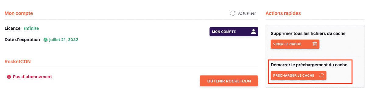 Si vous allez dans l’onglet “tableau de bord” et cherchez le bouton dans “Actions rapides”, vous trouverez la même option pour vider et précharger le cache.