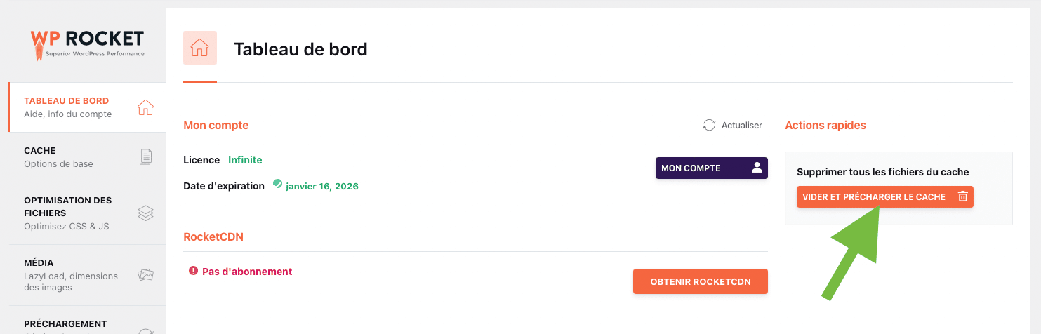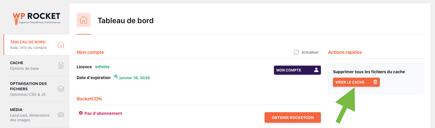 Vous trouverez le même bouton « Vider le cache » dans l’onglet “Actions Rapides” du tableau de bord.