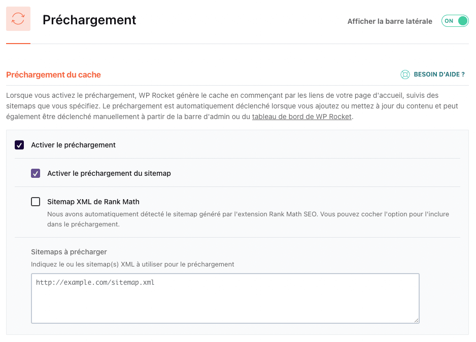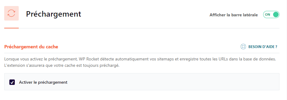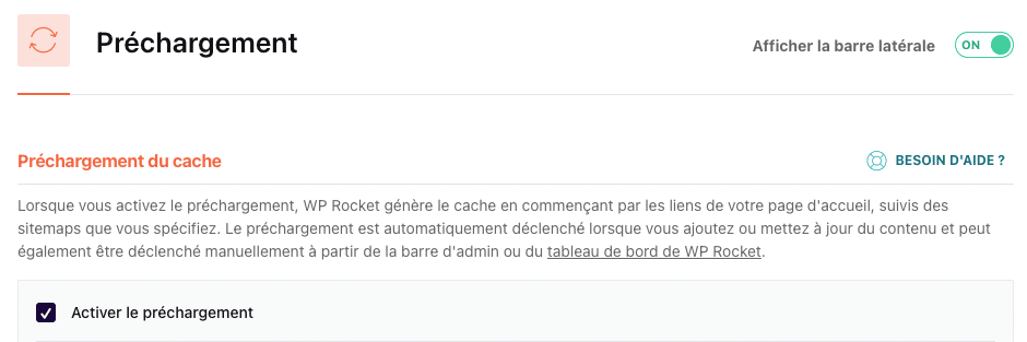 L’autre changement concerne l’onglet “Préchargement” (Preload). La fonction de préchargement du cache ne comprend plus qu’une seule option pour précharger toutes les URL du site. Vous n’avez donc plus besoin de cocher les deux cases pour la page d’accueil et le sitemap. À présent, il suffit de cocher seulement la fonction “Activer le préchargement” dans la section de préchargement du cache et WP Rocket s’occupera du reste.