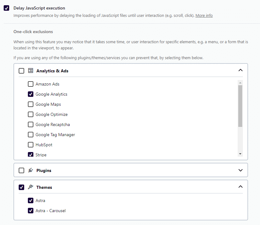 Let’s say your website uses Google Analytics and Stripe, and it’s built with Astra. You’ll see these options listed in the checklist. Flagging them will be enough to exclude such scripts from being delayed. As simple as that!