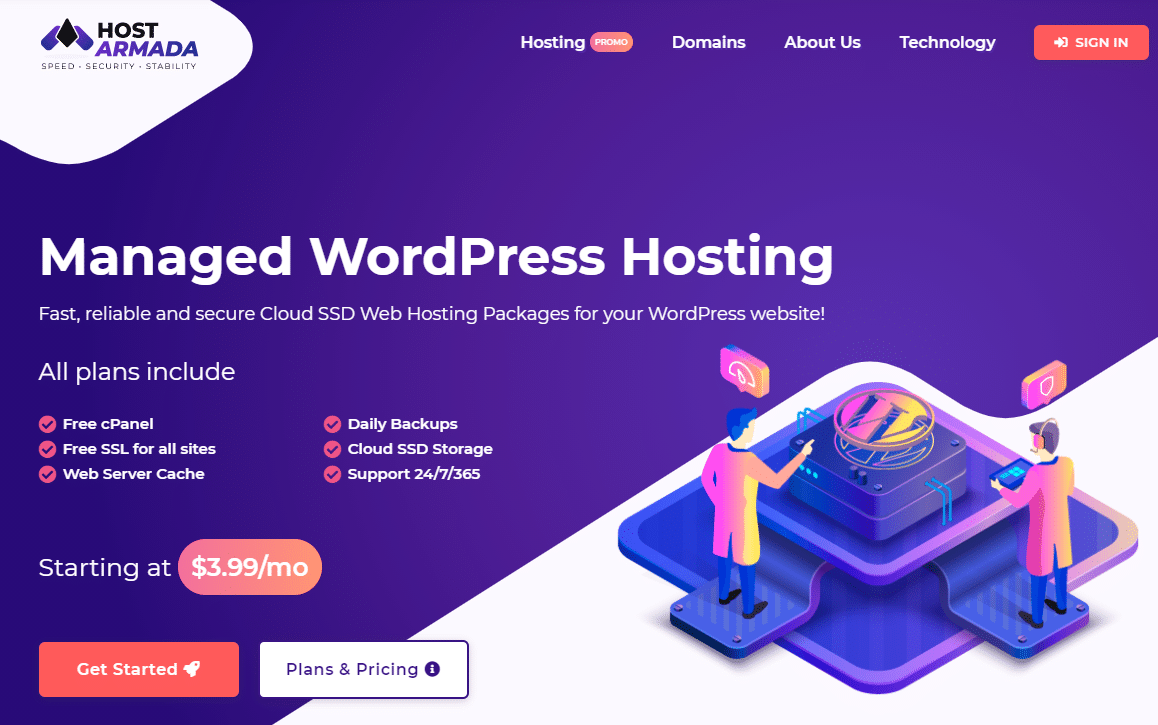 HostArmada is a fast and reliable managed WordPress hosting that includes default features such as free cPanel, free SSL for all sites, web server cache, daily backups, and cloud SSD storage. Plus, 24×7 technical support — which can always come in handy.