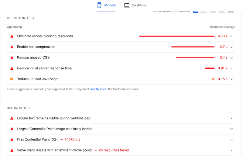 I got a 69/100 performance grade on mobile (orange interval), I also have two KPIs in the red (FCP and LCP) and 2 in orange (SI and TTI):