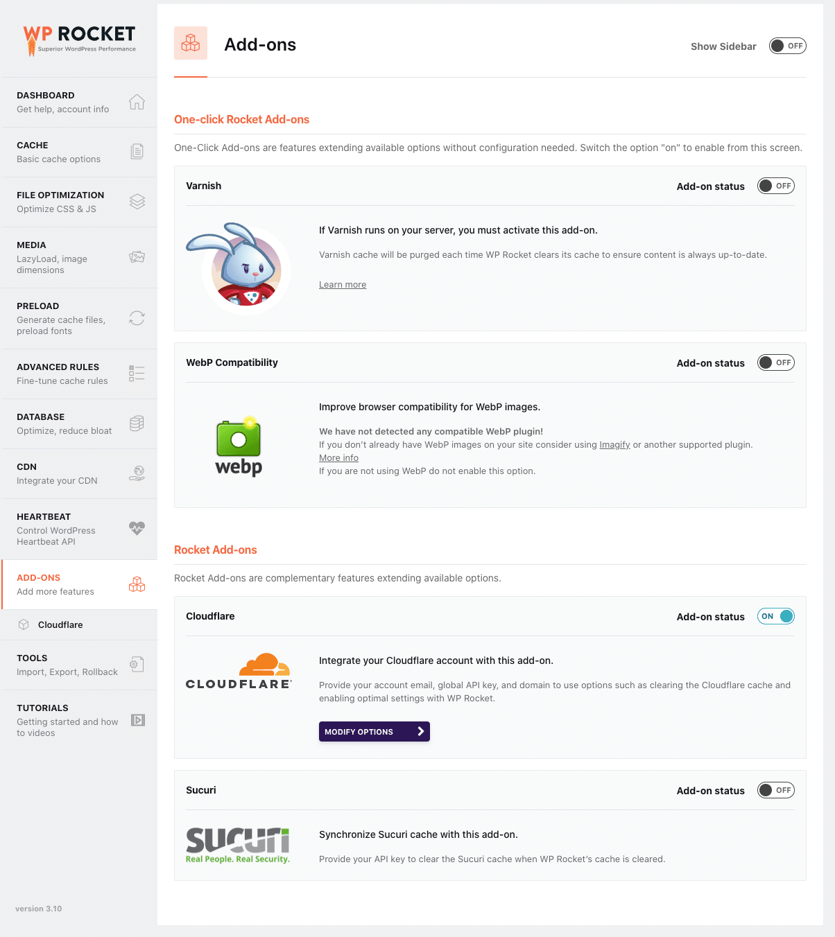 With WP Rocket 3.10, we took the opportunity to clean the interface and decided to move the WebP Compatibility option from the « Media » tab to the « Add-ons » tab.
