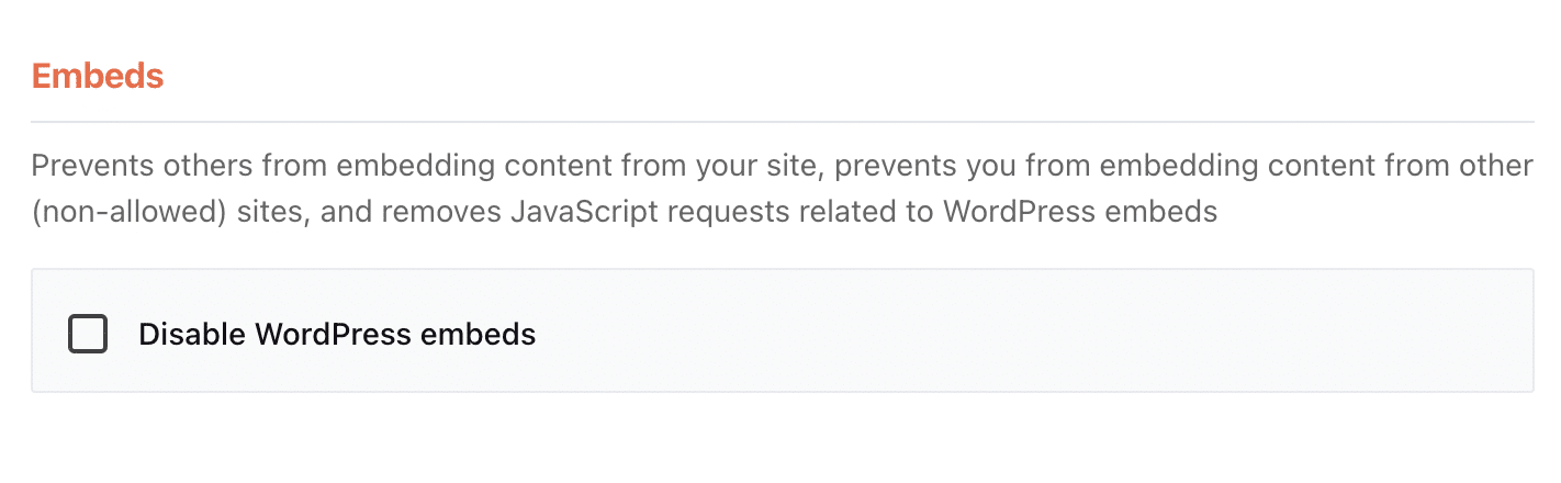 Wondering why we’re getting rid of this option? Disabling WordPress embeds only has a very limited impact on your website performance since it only removes one HTTP request of 1.2 KB in size. Pretty insignificant, right?