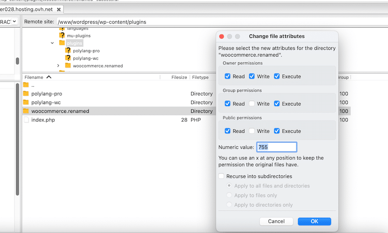 For example, I’m using Filezilla to access my test site, where permissions are set to 755 for folders: