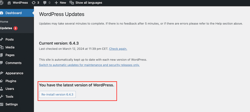 - From there, you can initiate the reinstall process by clicking on the Re-install version X.X.X button.