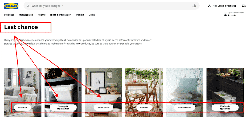 - Category listing pages (CLP) – A global category that lists other categories and targets very broad topics (e.g., Last Chance > Furniture, Home Decor, Home Textiles)