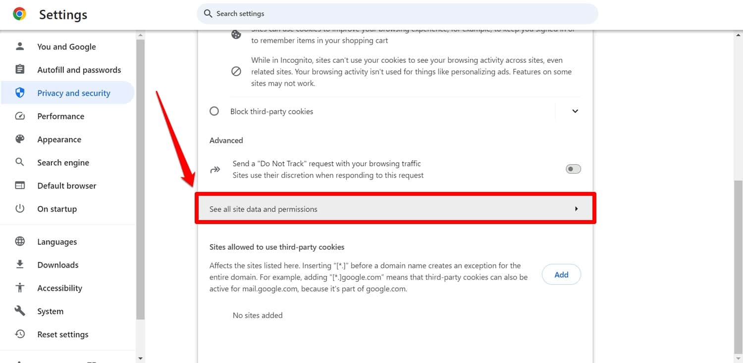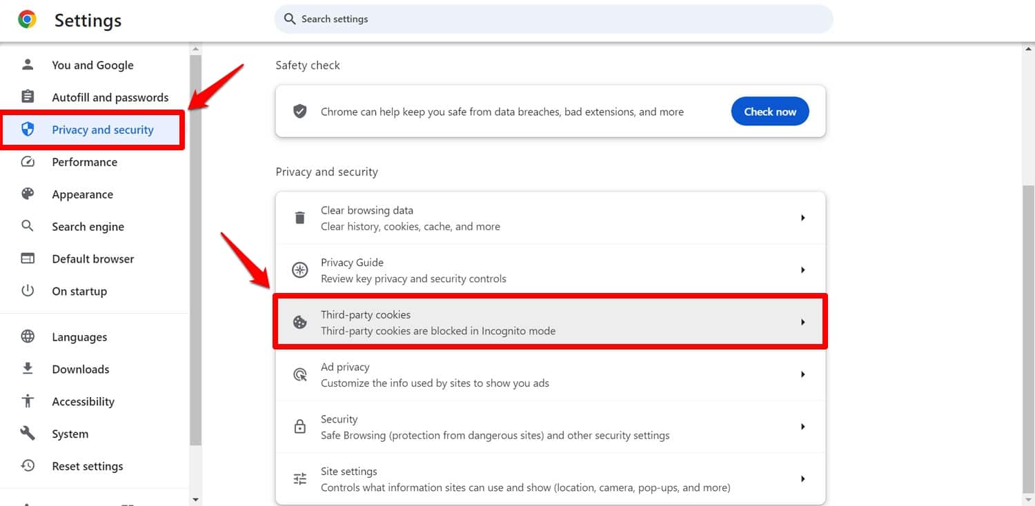 2. On the left, click on Privacy and security, then Third-party cookies.