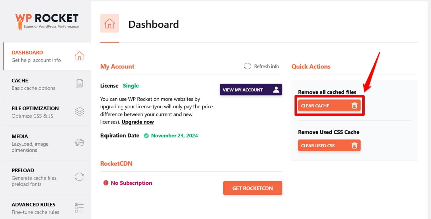 If you’re using WP Rocket, you can easily clear your cache by going to Settings > WP Rocket and clicking the Clear Cache button on the dashboard. You can also find additional info here.