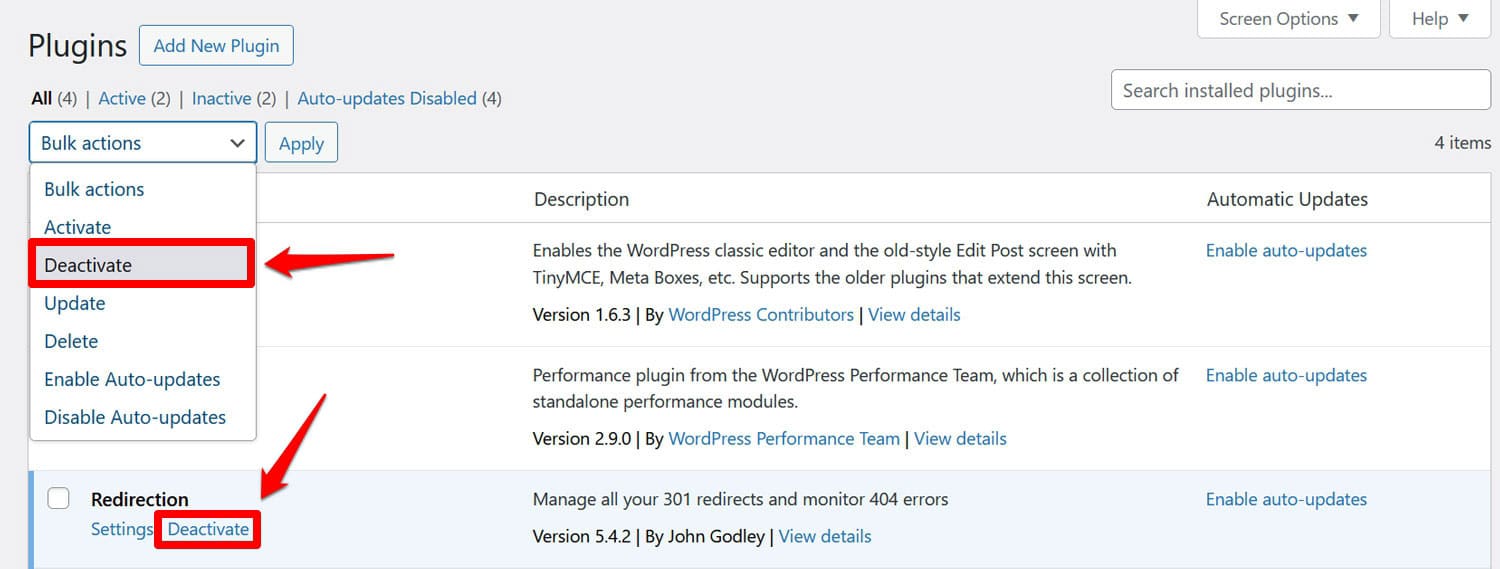 If you have any of those on your WordPress site, try deactivating them in the Plugins menu. You can do so both for individual plugins or all of them at once (via Bulk Actions).