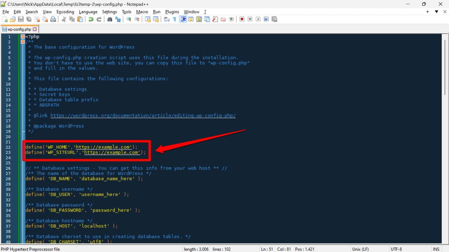 This resets your WordPress address and site address. Place the code right at the beginning of wp-config.php, then save and re-upload the file.