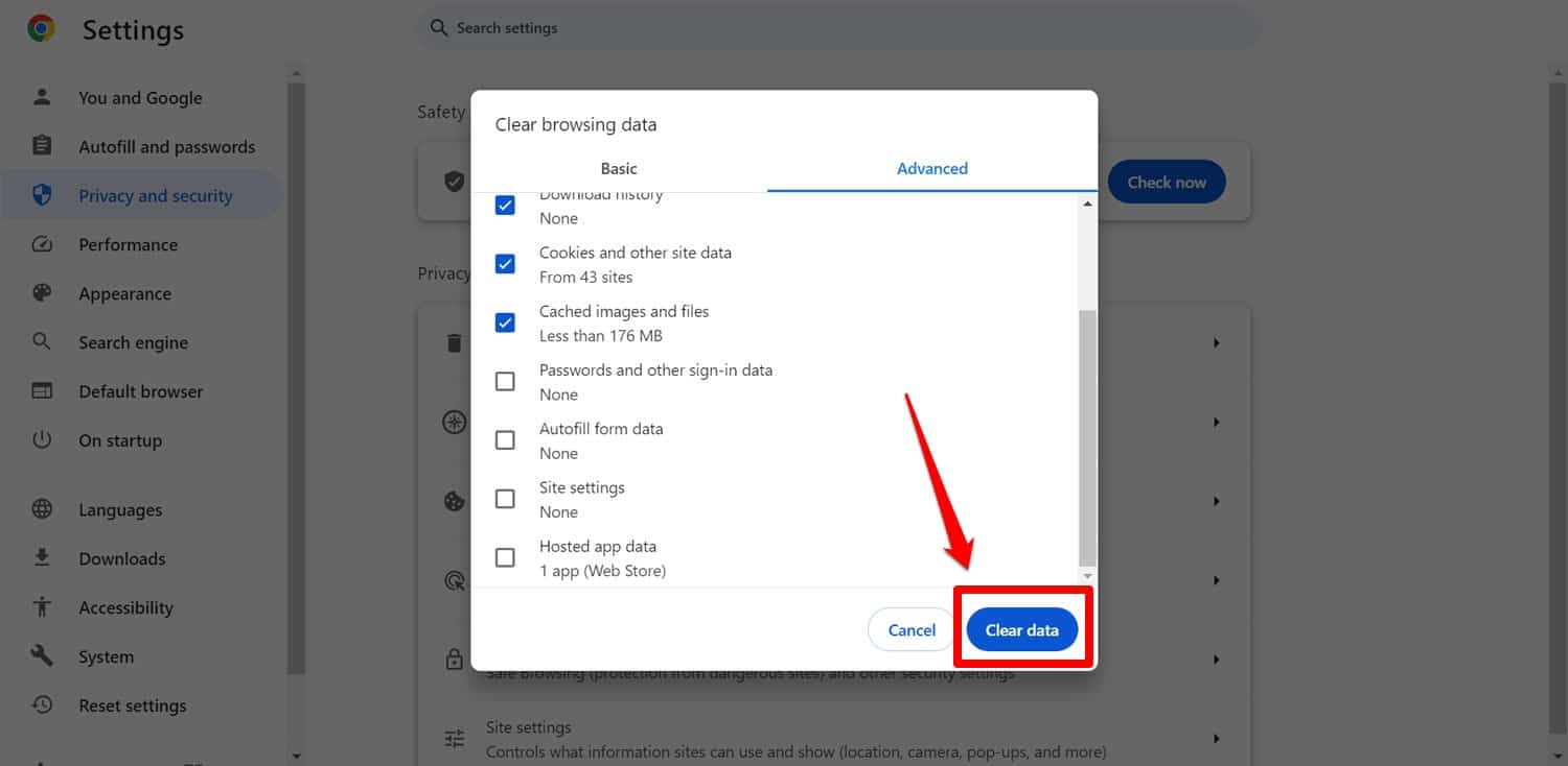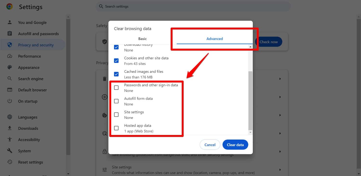 You can also delete additional data like passwords, auto-fill form data, and more using the Advanced tab, though this should usually not be necessary.