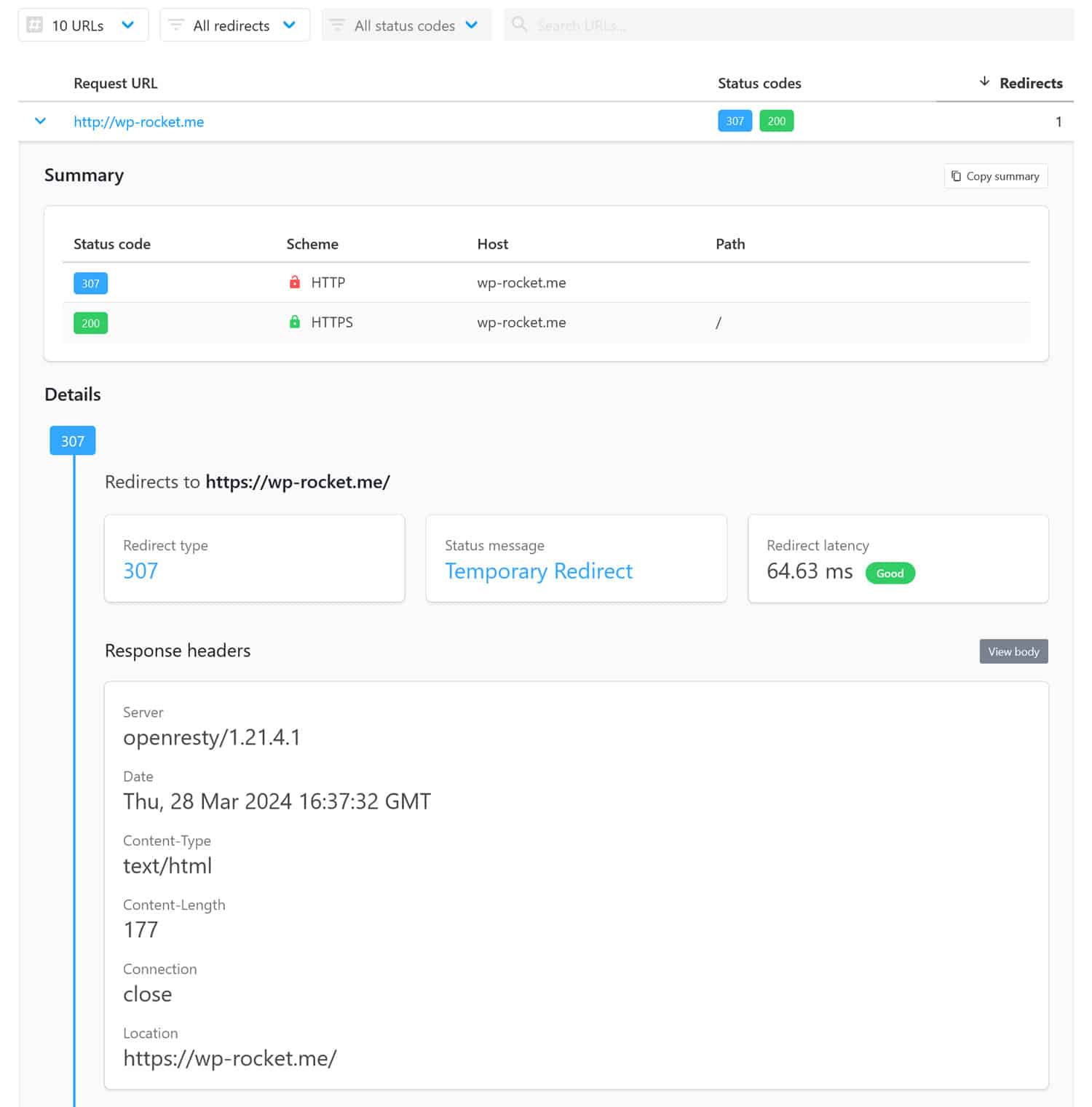 Simply enter your URL and submit. It will give you a list of active redirects and additional information about your site.