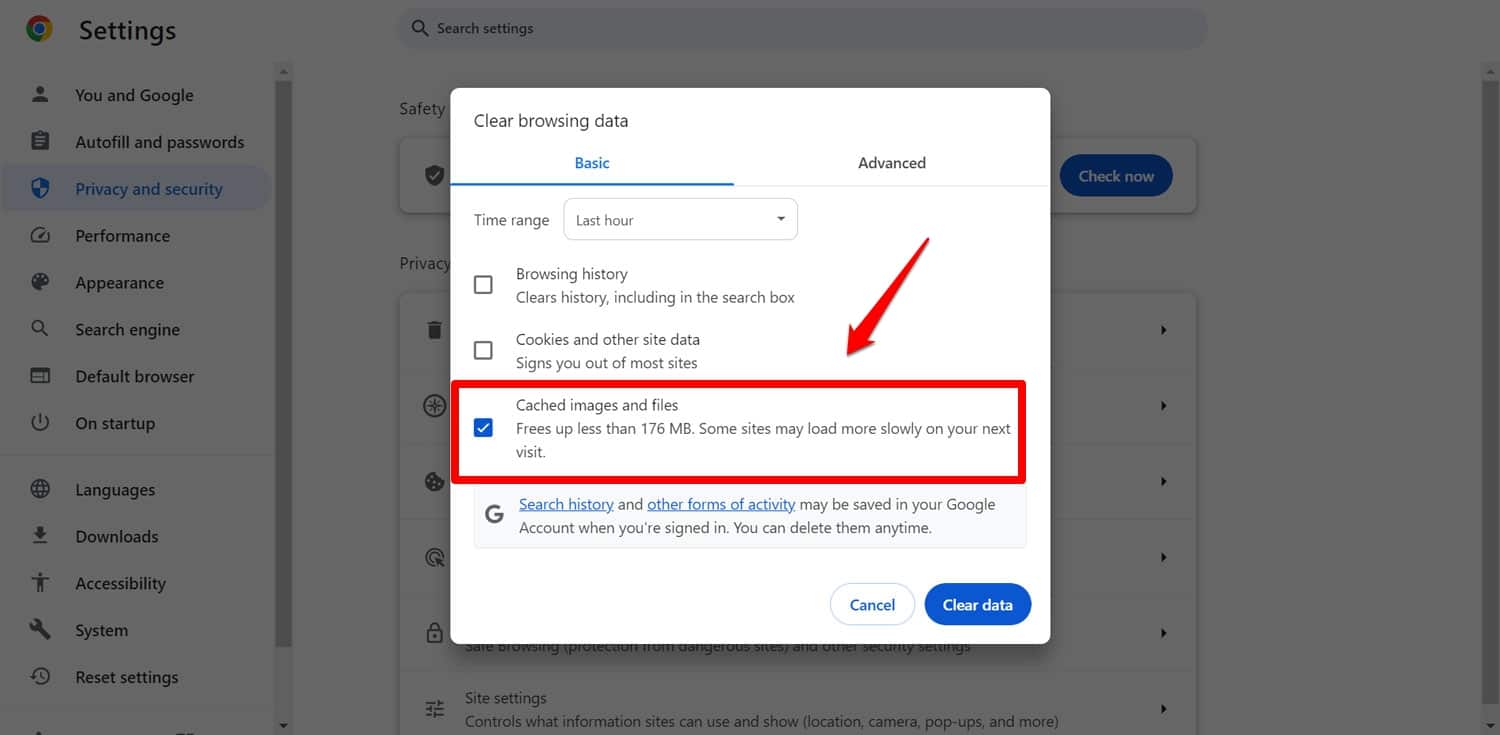 In the window that follows, make sure to only check the box for Cached images and files unless you also want to delete browser history, cookies, and other site data.