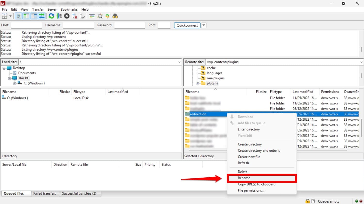 If you can’t access your WordPress admin dashboard, you can also disable plugins via FTP. Access your server and go to wp-content. Rename the plugins directory to anything else to disable all plugins on your site.