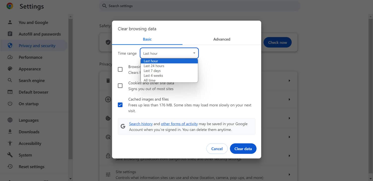 Use the Time range drop-down menu to configure how far back you want to delete cached files.