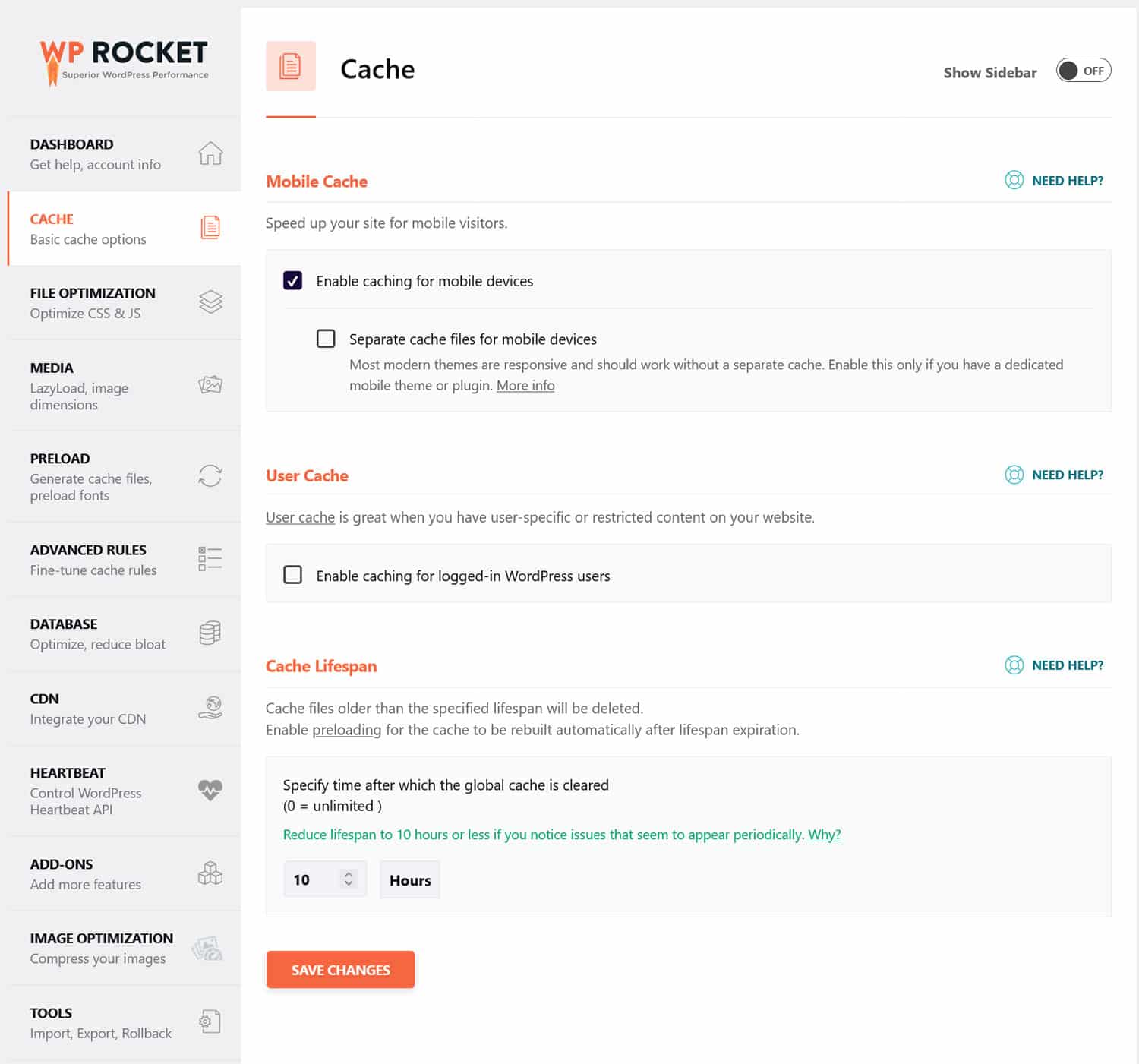 That’s why WP Rocket automatically implements caching on your WordPress website out of the box. In addition, you can enable mobile cache with a simple checkmark and modify the cache lifespan in an easy-to-use interface.