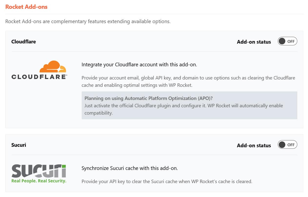Better yet, if you are going to be using a CDN, why not configure it more easily with WP Rocket? It comes with dedicated add-ons for Cloudflare and Sucuri, two of the most popular solutions on the market.