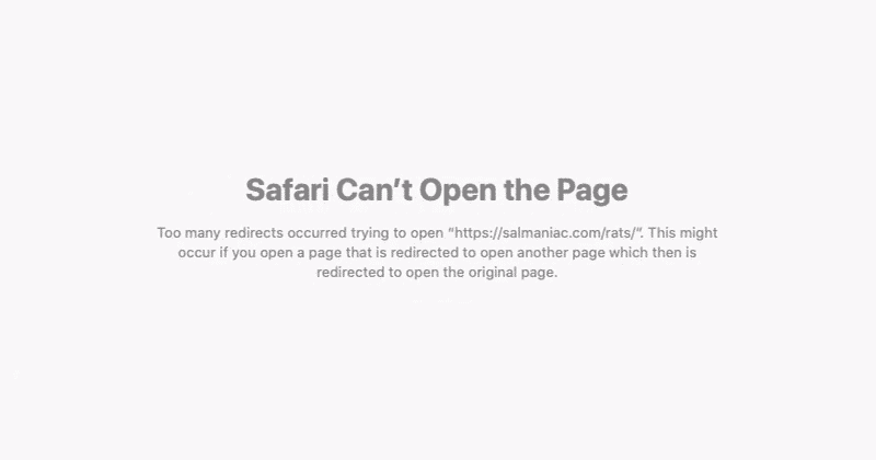 “Safari Can’t Open the Page. Too many redirects occurred trying to open “[domain].” This might occur if you open a page that is redirected to open another page which is then redirected to open the original page.”