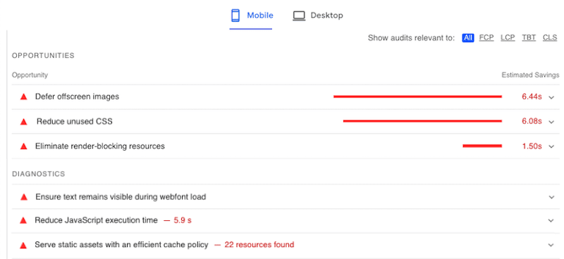 Besides checking the KPIs, it’s also interesting to look at the Lighthouse diagnosis and opportunities sections of PageSpeed Insights. This will allow us to see the areas of improvement for each builder.