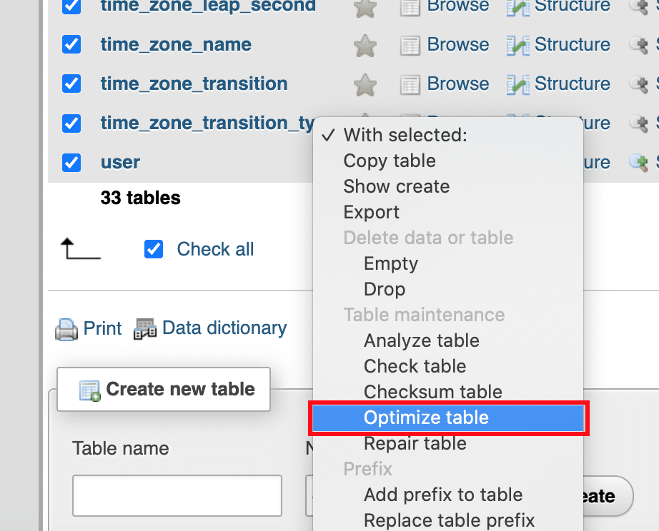 4. Select the Optimize table option: