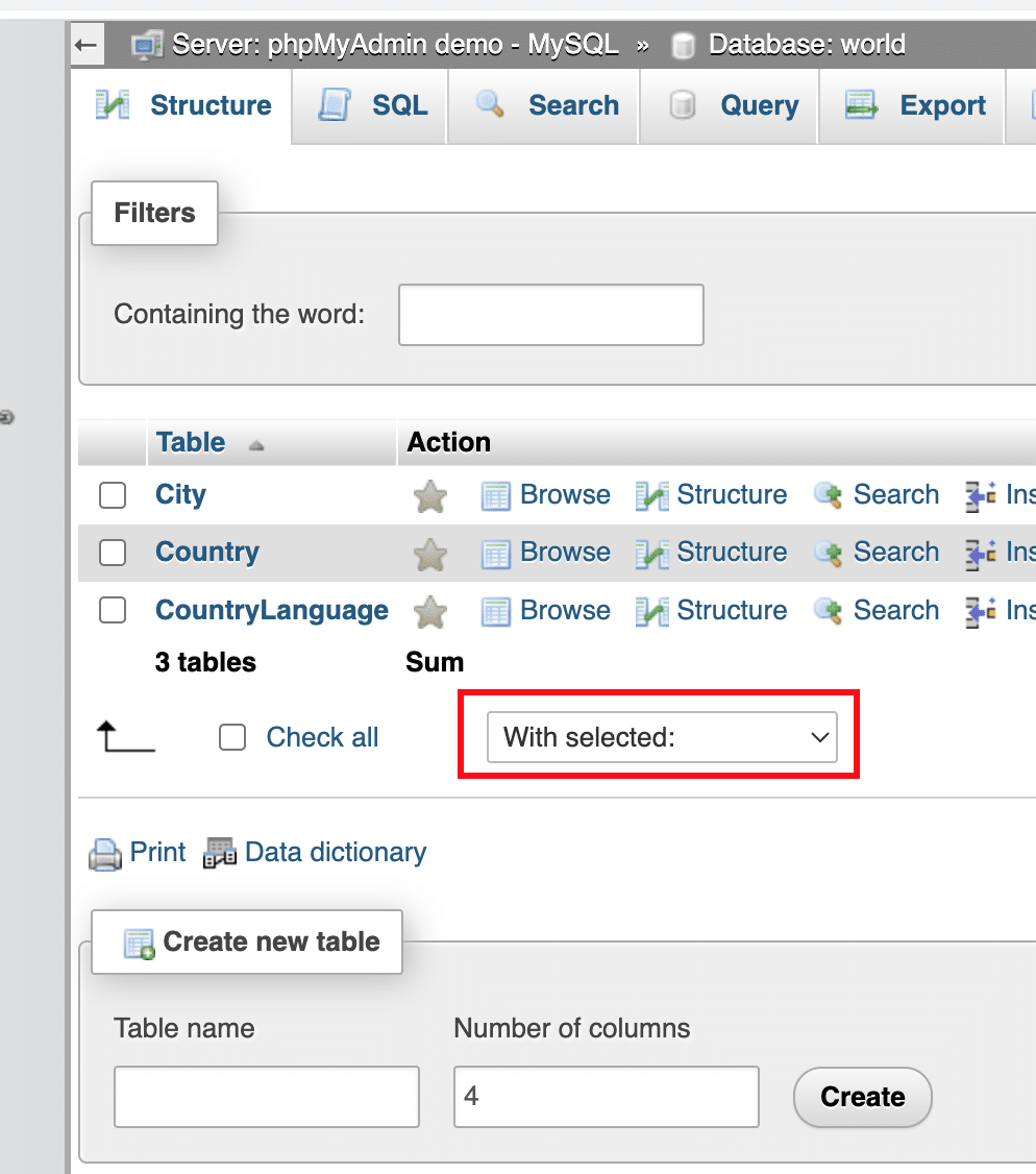 3. Once the tables are selected, open the dropdown menu located next to the Check all button: