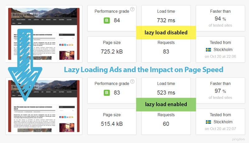 I used the speed measurements that are included in Pingdom and ran a dozen tests for this example with Lazy Load enabled and disabled. The average load time of that page was around 740ms. After enabling Lazy Load for the ad at the end of the post, the load time dropped to below 540ms.