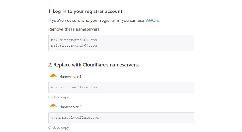 When you sign up for your free Cloudflare account and start the “Add Site” wizard, Cloudflare will prompt you to change your domain’s nameservers to point towards Cloudflare. Again, this is required because of Cloudflare’s reverse proxy approach: