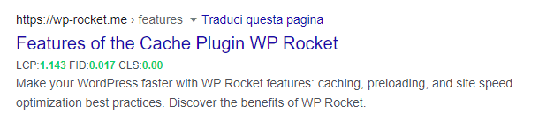 Il existe aussi l’extension CORE Serp Vitals, qui montre le score des Core Web Vitals directement sur les SERPs (search engine result pages). Il vous faut une clé API de Chrome UX pour accéder aux résultats.